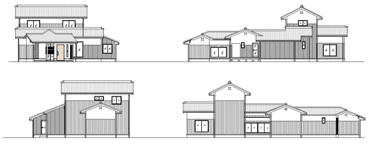 3) 外部の主な素材 古い町並みと呼応して外部の素材は日本瓦・白い壁・黒い板壁。 3棟の一番高い棟に鳥伏間の瓦をもうけ棟を強調。 現代的な軽い軒先瓦は丸い万十のない鎌軒瓦を使用しています。 黒い板は杉板に柿渋です。