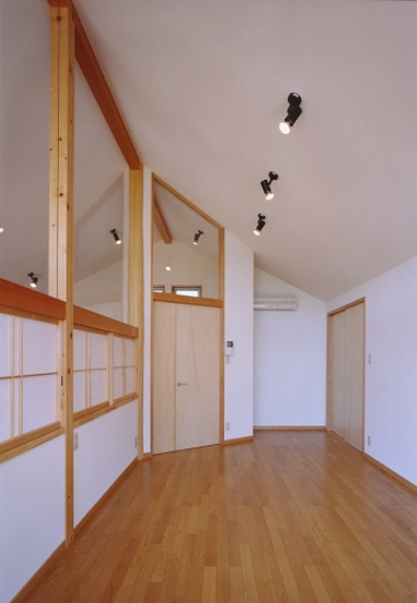 主寝室は、吹抜けと一体感を出すため上部に大きなガラスを